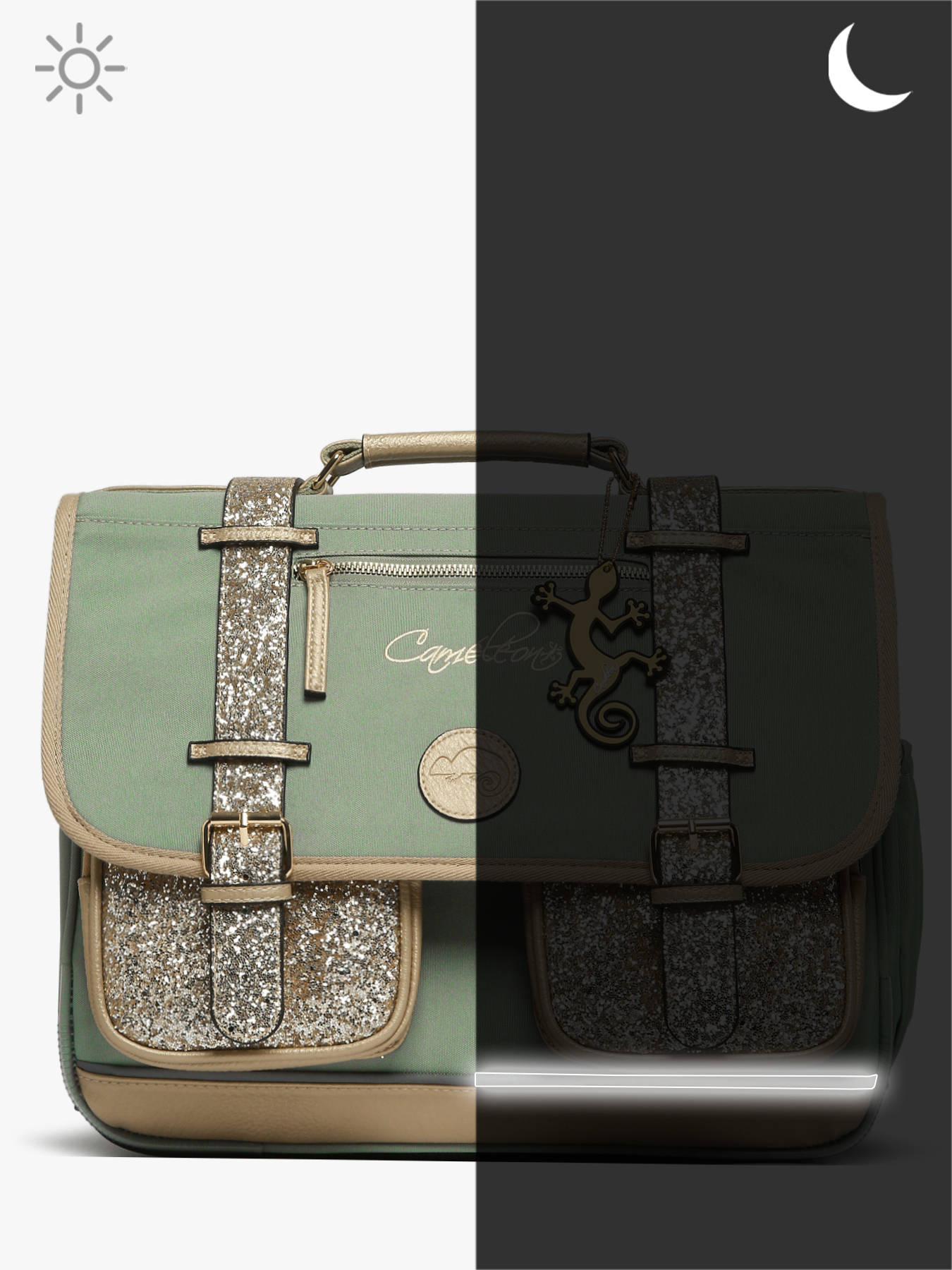 Deze schooltas uit de Vintage Fantasy collectie van het merk Caméléon heeft een breedte van 38 cm. Ideaal vanaf het eerste leerjaar! Dit model heeft een duidelijke vintage look, dankzij de twee voorvakjes in lederlook en de riempjes met gesp. De schooltas beschikt over twee compartimenten, die schriften (24x32 cm) en schoolboeken van A4 formaat kunnen bevatten. Onder de overslagflap bevindt zich ook een uniek opbergvakje, met een gratis liniaal! De twee vakjes vooraan sluiten met rits, en zijn ideaal om een snack of andere kleine spulletjes in te stoppen. Dit model beschikt ook over een naamlabel aan de achterzijde, en kan makkelijk gesloten worden dankzij een dubbel kliksysteem. Voor optimaal comfort zijn de rugzijde en schouderbanden gewatteerd. Dankzij enkele reflectoren kan uw kind zich ook veilig in het verkeer begeven. Vintage op z'n mooist!