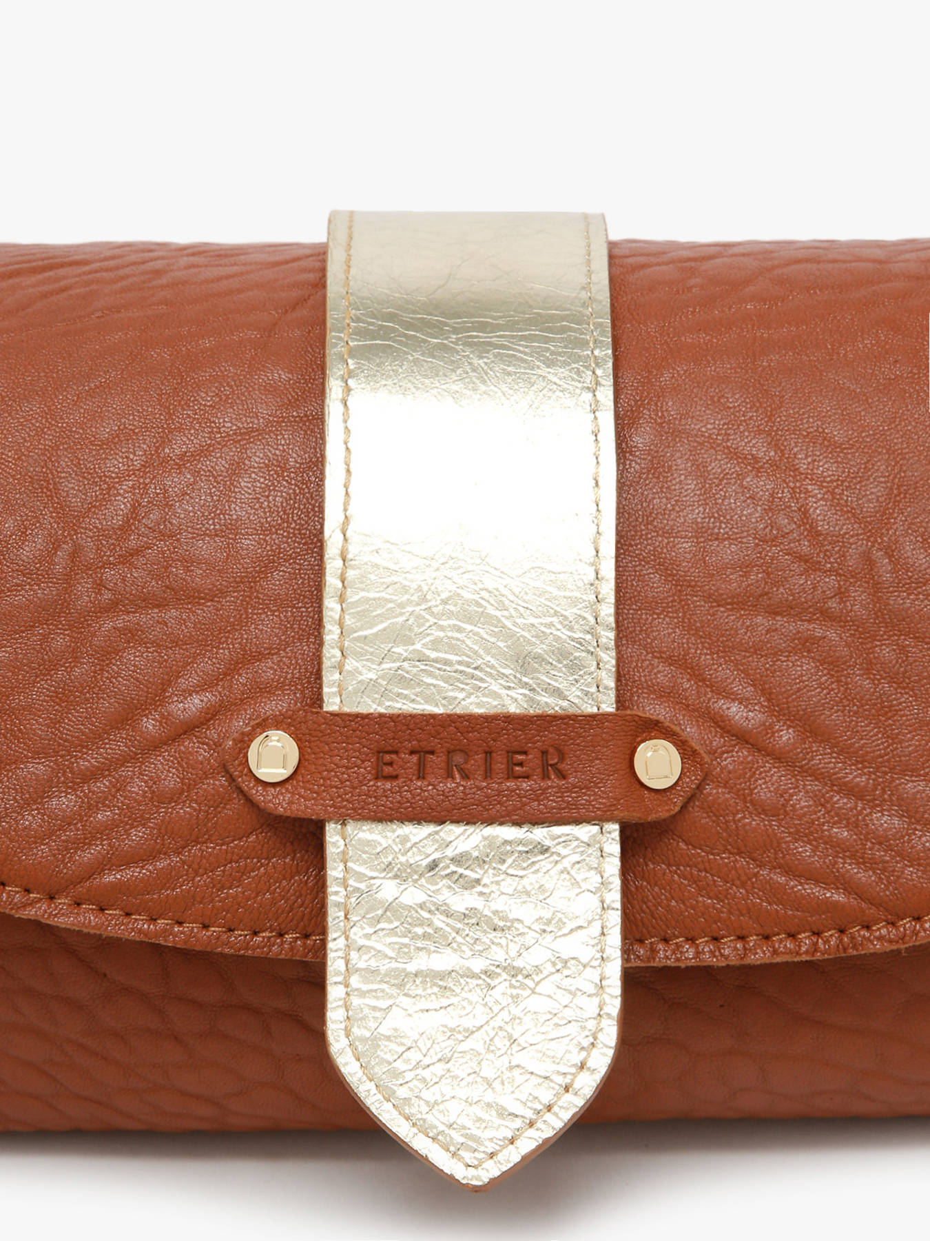 De AGNES-tas van ETRIER is vervaardigd uit Frans ""bubble"" schapenleer, maat M, met een flap voorzien van een drukknoop en een verstevigde bodem voor een optimale vormvastheid. De omkeerbare riempje, met een goudkleurige zijde en een zijde in bijpassend leer, wordt eenvoudig bevestigd dankzij twee kraagknopen en schuift in een achtervak dat speciaal hiervoor wordt ontworpen. De met leer gevoerde binnenkant bevat drie compartimenten, waaronder een centraal ritsvak, zodat uw persoonlijke spullen gemakkelijk kunnen worden georganiseerd. Het ETRIER-logo, in natuurlijk leer, is versierd met een klein Frans vlaggetje dat een elegante en onderscheidende vleugje toevoegt. De schouderriem is bij levering ingesteld op 65 cm, maar de lengte kan eenvoudig worden aangepast dankzij een discrete knoop aan de binnenkant van de tas. U hoeft enkel te trekken, de knoop los te maken, de lengte aan te passen en vervolgens de knoop opnieuw te leggen voor een perfect draagcomfort.