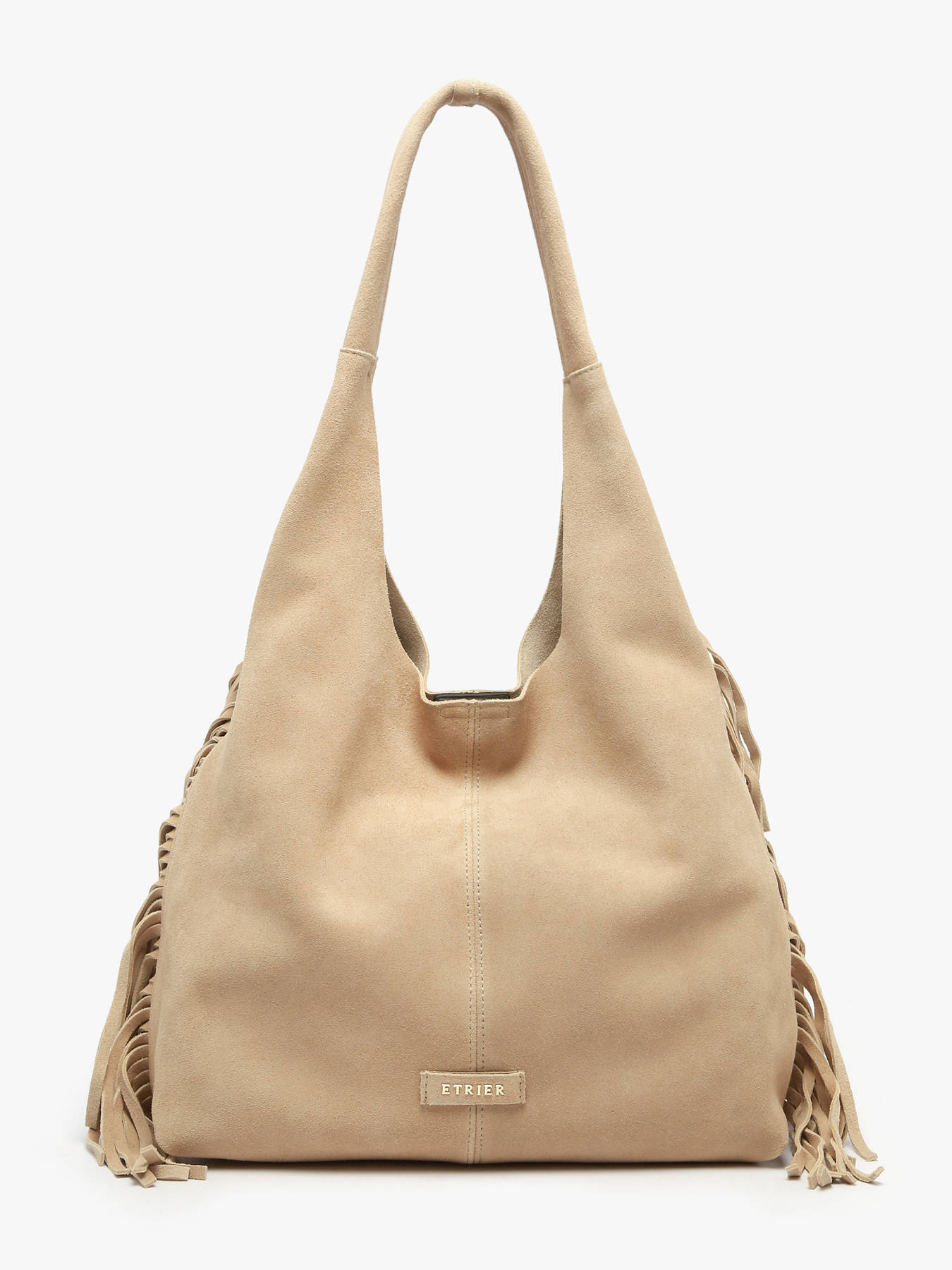 De ETRIER schoudertas uit de COUNTRY-lijn is gemaakt van suède leer. Dit kleine model met een hobo-silhouet valt op door zijn zijwaartse franjes en uitgesproken bohemienstijl. Hij heeft een opgestikte zak aan de achterkant en sluit met een magneet. Aan de binnenkant bevindt zich een afneembare pouch om je essentials georganiseerd te houden. Dit compacte model belichaamt een vrije en elegante geest, perfect om je winteroutfits karakter en authenticiteit te geven.